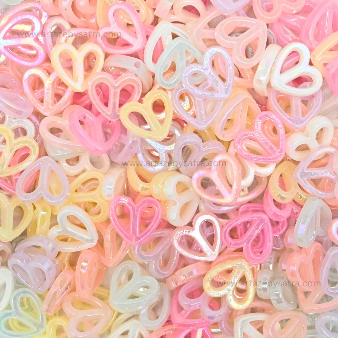 Unleash your creativity with our delightful assortment of pastel shiny Peace Sign Heart beads! This generous 100 & 500-gram pack features a charming mix of iridescent acrylic beads in soft, captivating pastel shades, including pink, yellow, blue, purple, and cream. Each bead boasts a unique "Peace Sign Heart" or texture, with some also featuring a charming floral or starburst shape, adding depth and visual interest to your creations. The iridescent finish gives them a beautiful, subtle shimmer, catching the light playfully