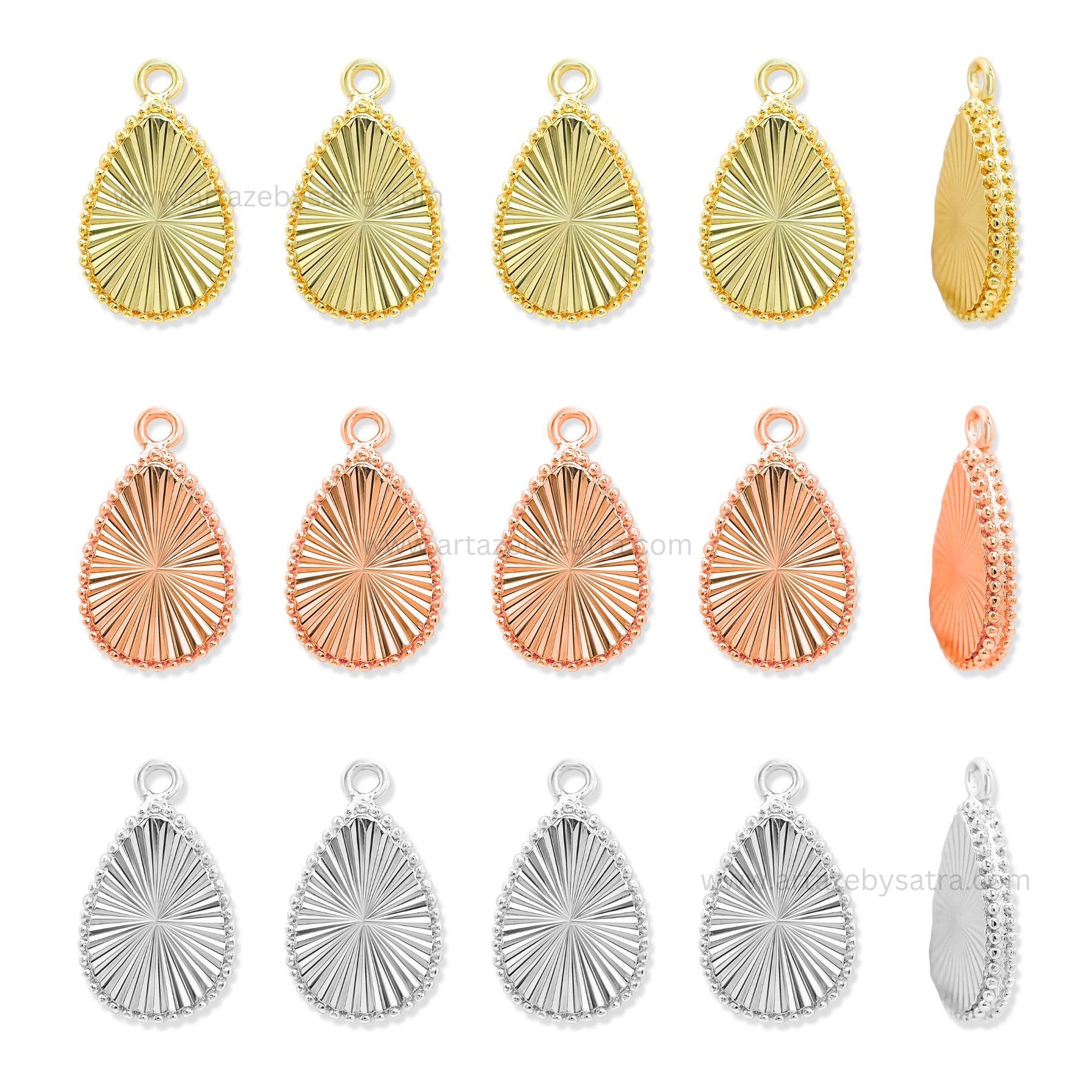 Create captivating jewelry pieces with these textured teardrop or leaf pendants. The radiating lines create a subtle visual interest, while the beaded border adds a delicate touch. Available in a lovely range of metal finishes: gold, rose gold, and silver.